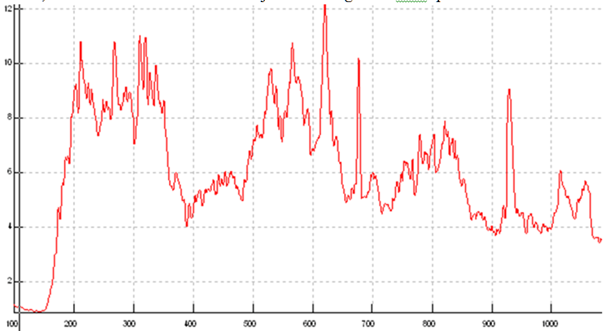 Om de grafiek te kunnen begrijpen is misschien enige uitleg nodig: De getallen van 100 tot en met 1100 in de onderkant gaan over de frequentie, het aantal trillingen per seconde die we uitdrukken in Hertz (Hz). De getallen aan de verticale zijlijn geven de geluidsterkte of volume aan, meestal uitgedrukt in Decibel (Db). Op deze manier kunnen we dus mooi zien hoe sterk elke frequentie in de stem doorklinkt. Overigens heet een dergelijke spectrumanalyse een Fast Fourrier Transformatie (FFT)